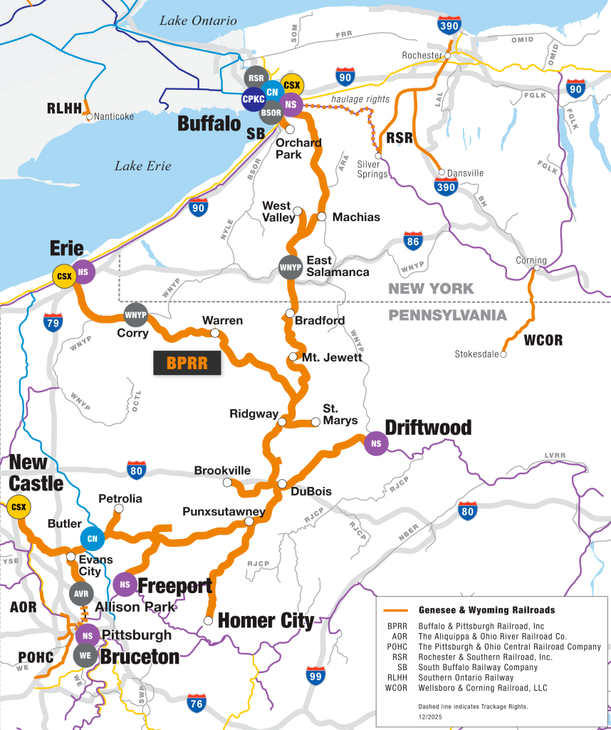 - Canadian National (Buffalo, N.Y. and Butler, Pa.); CPKC (Buffalo, N.Y.); CSX (Buffalo, N.Y.; Erie, Pa. and New Castle, Pa.); Norfolk Southern (Buffalo, N.Y.; Erie, Pa.; Driftwood, Pa.; Freeport, Pa. and Pittsburgh, Pa.); Rochester & Southern Railroad (Buffalo, N.Y.); Buffalo Southern Railroad (Buffalo, N.Y.); Western New York & Pennsylvania Railroad (East Salamanca, N.Y.); Allegheny Valley Railroad (Allison Park, Pa.); Wheeling and Lake Erie Railway (Bruceton, Pa.)