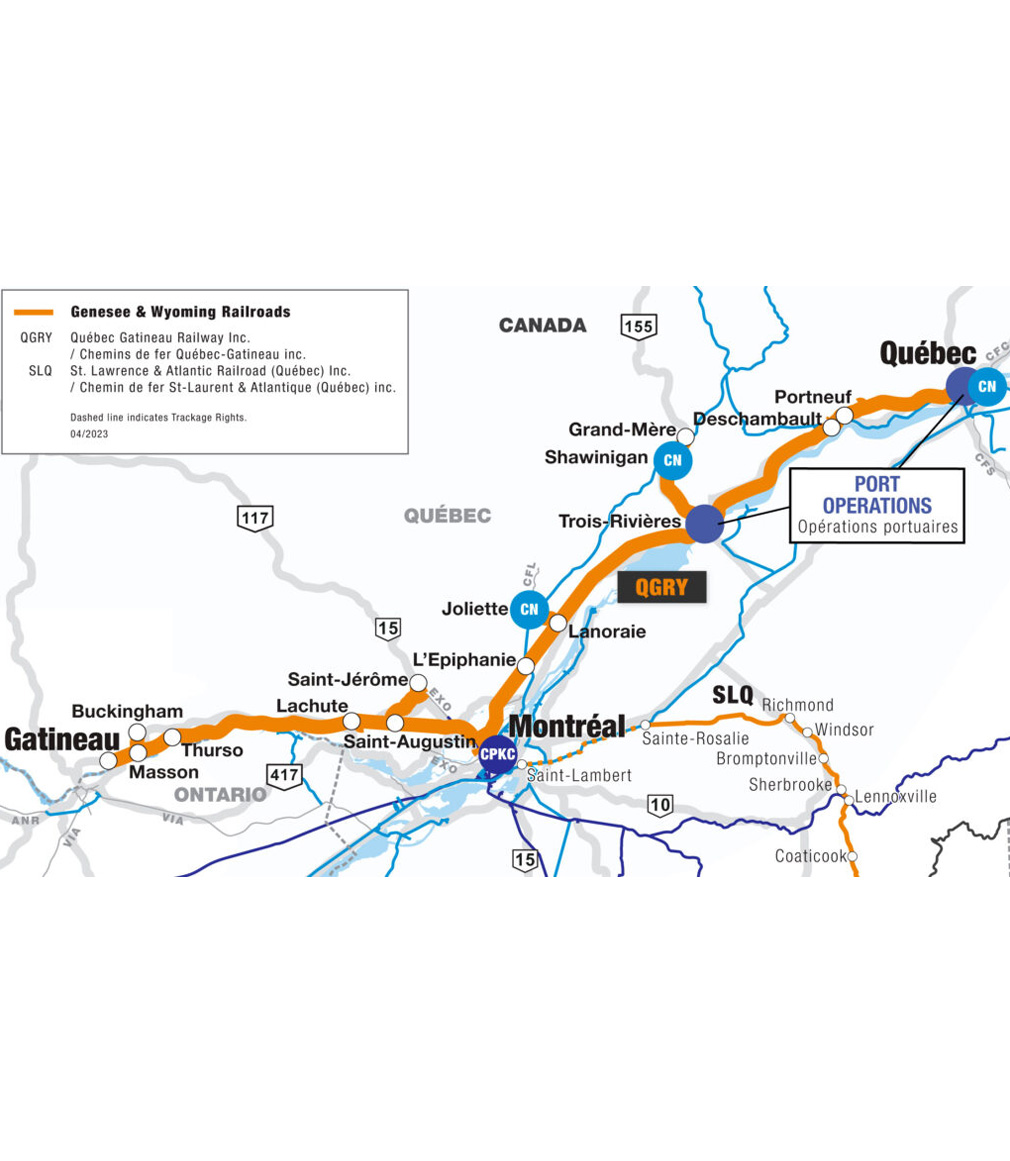 Canadian Pacific Kansas City (Montreal, Quebec); Canadian National (Joliette, Quebec; Shawinigan, Quebec and Quebec City, Quebec)