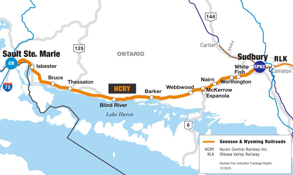 Track Miles (as of 06/2024) Owned/Leased/Operating Rights: 196 Interchanges Canadian National (Sault Ste. Marie, Ontario); CPKC (Sudbury, Ontario) Capacity 268k Railcar Storage Available 199 spots Acquired by G&W 1997 Bonded Carrier No May 26, 2021- Media Statement Print this map Email this map View interactive map View detailed map Print This Overview