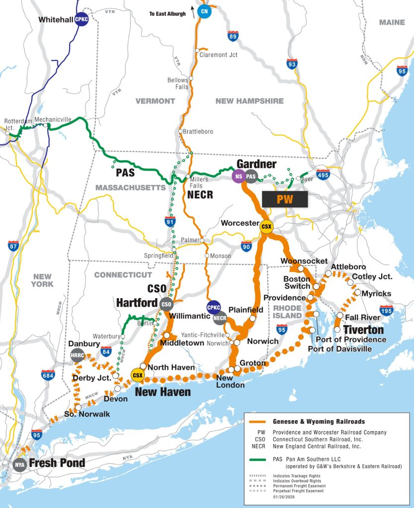- Canadian National (East Alburg, Vt.); Canadian Pacific (Willimantic, Conn. and Whitehall, N.Y.); Connecticut Southern Railroad (Hartford, Conn.); CSX (Worcester, Mass. and New Haven, Conn.); New England Central Railroad (Willimantic, Conn.); New York & Atlantic Railway (Fresh Pond/Queens, N.Y.); Norfolk Southern (Gardner, Mass.); Pan Am Railway (Worcester, Mass.); Pan Am Southern (Gardner, Mass.)