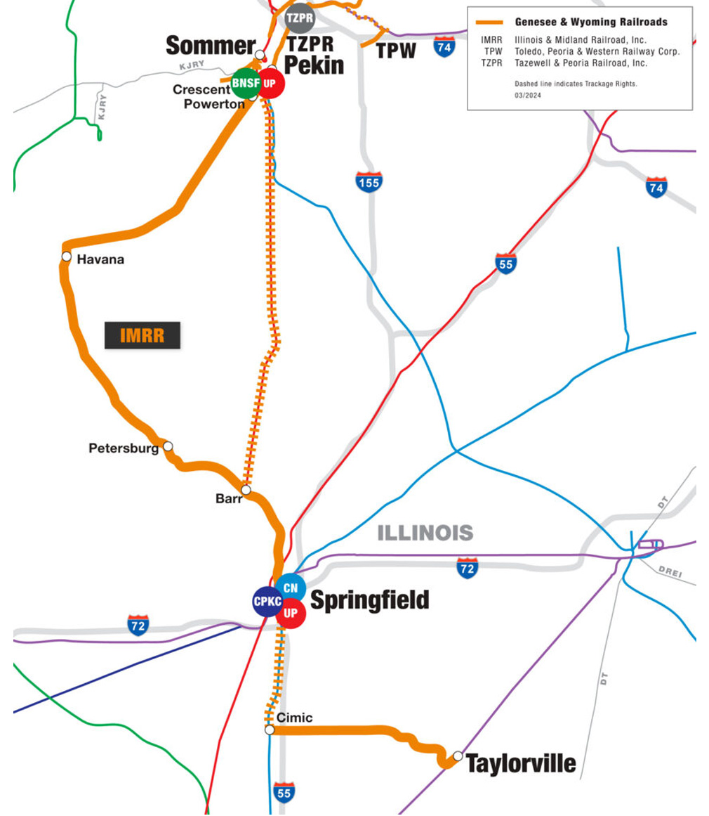 BNSF (Crescent, Ill.); Canadian National (Springfield, Ill.); CPKC (Springfield, Ill.); Tazewell & Peoria Railroad (Creve Coeur, Ill.); Union Pacific (Crescent, Ill. and Springfield, Ill.)