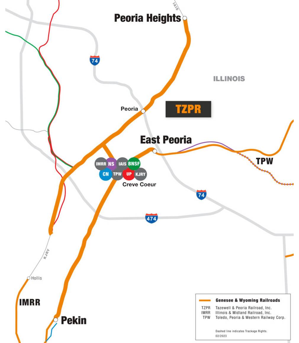 BNSF (Creve Coeur, Ill.); Canadian National (Creve Coeur, Ill.); Keokuk Junction Railway (Creve Cœur, Ill.); Illinois & Midland Railroad (Creve Coeur, Ill.); Iowa Interstate Railroad (Creve Cœur, Ill.); Norfolk Southern (Creve Coeur, Ill.); Toledo, Peoria & Western Railway (Creve Coeur, Ill.); Union Pacific (Creve Coeur, Ill.)